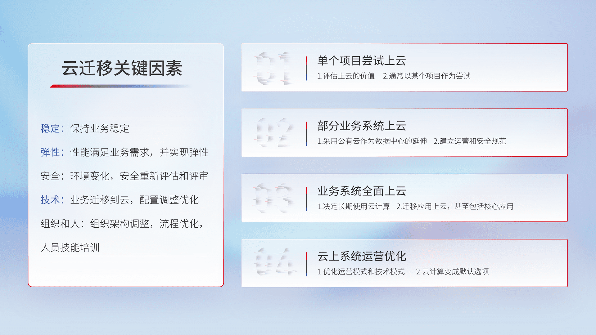 结合实际业务,,,,从规划设计、、、云平台选型、、、云原生改造、、、数据迁移、、、集成交付,,迁移全过程为客户识别最佳上云路径,,,,做好风险识别管理,,,设计网络架构、、、身份权限、、、安全审计合规、、、、操作审计、、、、日志审计、、、、监控告警策略、、、多站点容灾设计等,,,,对云上基础设施进行整体规划,,,,提升IT治理水平,,以满足弹性、、高可用、、、高性能的需求。。