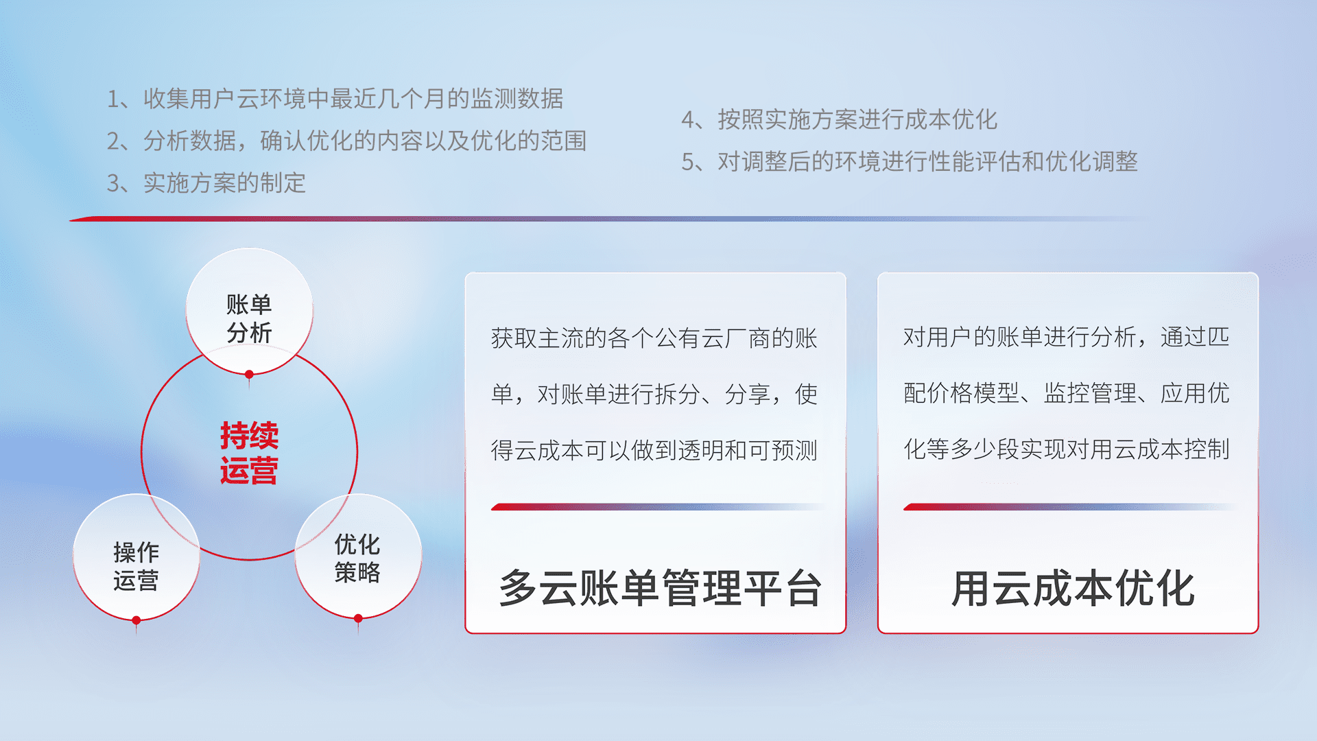 通过多云纳管,,,,以统一的资源数据模型把客户的云资源进行抽象和封装,,,,进而实现对多云资源的统一操作,,,保障云资源管理的可靠性、、、稳定性与可用性。。。量身定制化运维内容,,,配置、、开发运维、、、、补丁管理、、备份、、、、监控、、、认证和访问管理、、审计和日常巡检等,,,保障在用云过程中的可靠度,,稳定度以及高可用率。。。。